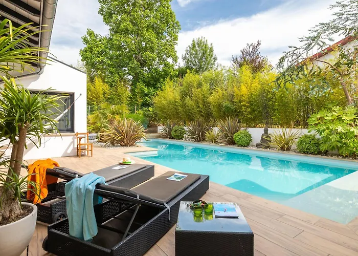 The 3-bedroom Villa Manureva - Piscine Au Sel Biarritz is located 3.5 km from the Biarritz Tourist Office and provides table tennis for active guests. Located within a 10-minute drive of the Le Phare Golf Course, this 3-bathroom villa boasts a terrace with views of the city.